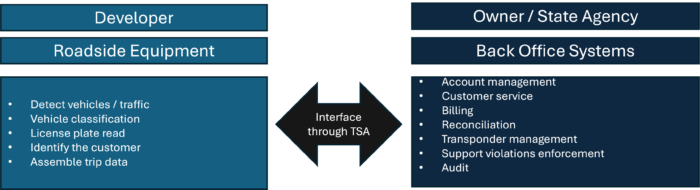 Most PML P3s adopt a Tolling Services Agreement (TSA), identifying the tolling responsibilities of the owner or the applicable publicly operated toll agency within the state. Key responsibilities of the developer and the state agency under a typical TSA are shown in Figure 2.